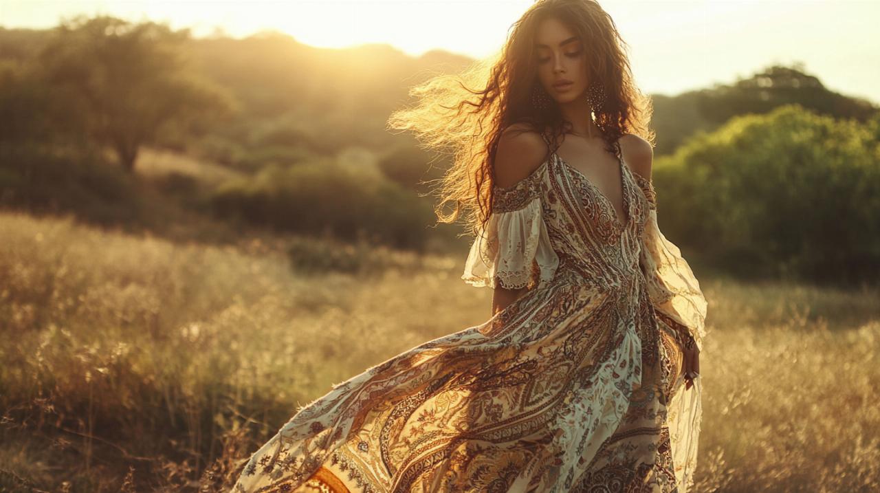 La elección del tejido es tan importante como el diseño mismo del vestido. Los materiales naturales como el algodón, la gasa, el lino y la seda no solo aportan comodidad y transpirabilidad, sino que también se alinean con la filosofía bohemia de respeto por el medio ambiente y uso de recursos naturales. El algodón ofrece frescura y facilidad de mantenimiento, ideal para el uso diario o eventos al aire libre. La gasa y la seda proporcionan una caída elegante y fluida que favorece especialmente las siluetas más románticas y los eventos de tarde o noche. El lino, por su parte, es perfecto para climas cálidos y aporta una textura rústica que complementa a la perfección el estilo folk. En cuanto a las siluetas, los diseños sueltos y fluidos característicos de los vestidos bohemios largos favorecen todo tipo de cuerpos al no marcar excesivamente la figura. Las opciones con cintura alta ayudan a estilizar la silueta y alargar visualmente las piernas. Los vestidos con corte imperio son ideales para figuras con poco busto, mientras que los modelos con escote en V favorecen a quienes desean estilizar el torso. Las mangas de diferentes longitudes también juegan un papel importante en la elección: las mangas largas con bordados aportan romanticismo y cubren los brazos de manera elegante, mientras que las mangas cortas o tipo campana ofrecen frescura y movimiento.